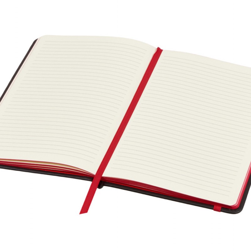 Блокнот в твердой обложке с закругленными углами черного цвета. Ляссе, резинка и срез яркого контрастного цвета делают его очень стильным и функциональным бизнес-аксессуаром.