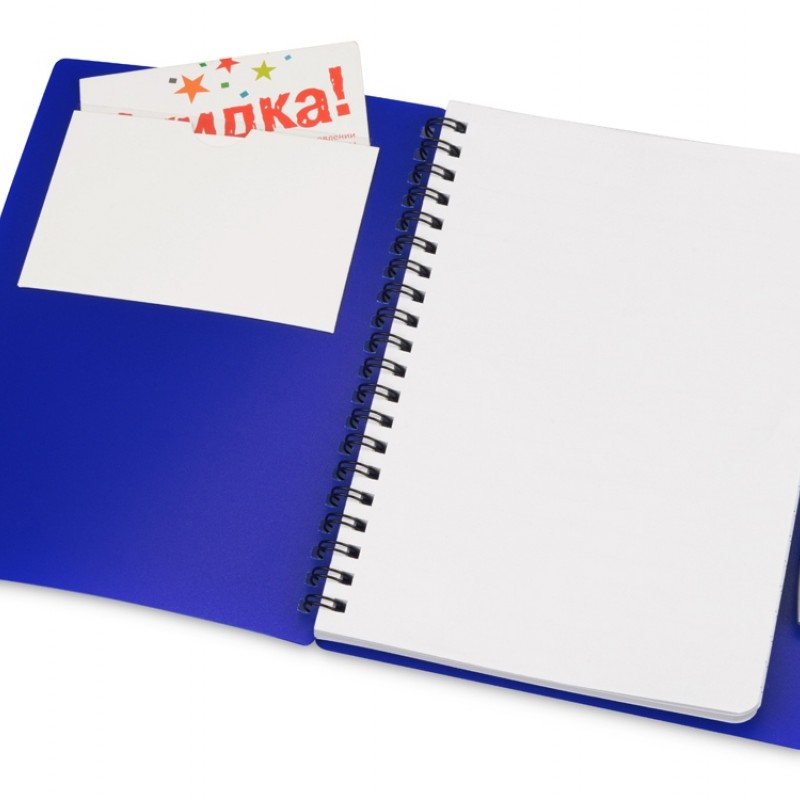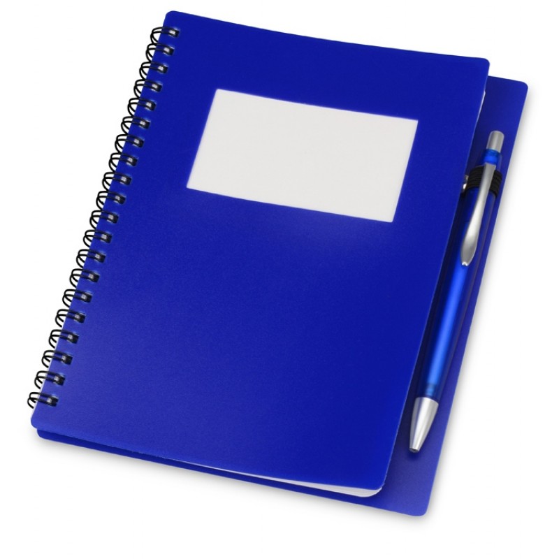 Блокнот Контакт в полипропиленовой обложке переплетен на пружине. В обложке блокнота предусмотрено окошко, в которое можно поместить визитную карточку или полиграфическую вставку. В комплекте с блокнотом идет ручка, которая вставляется в петельку сбоку.