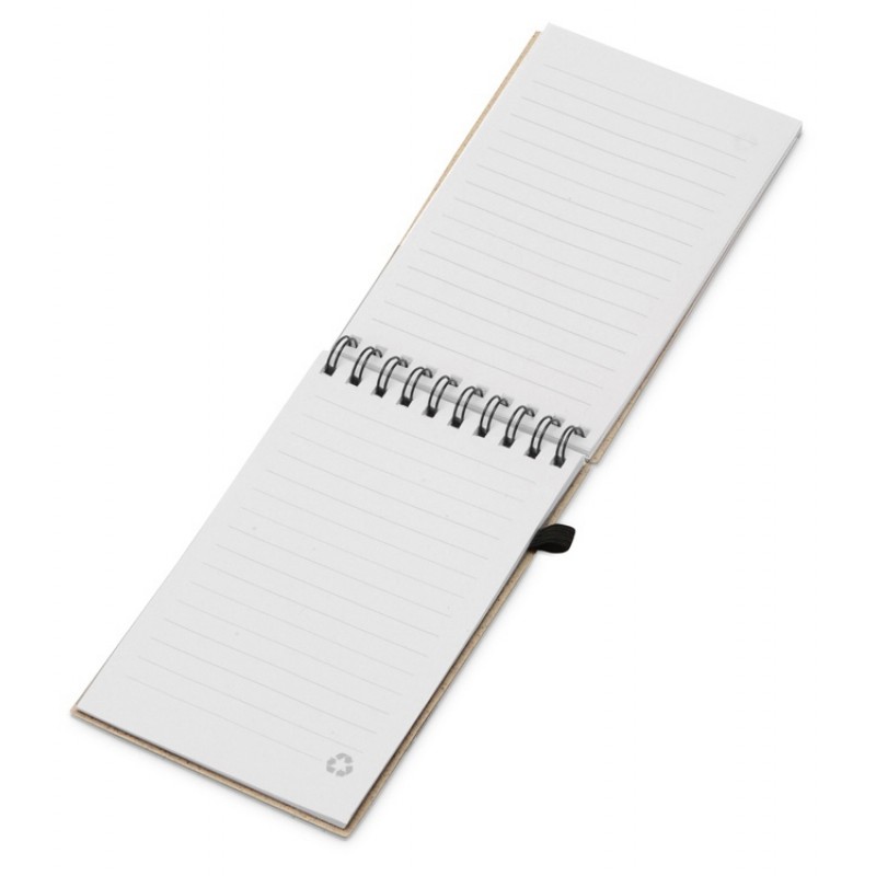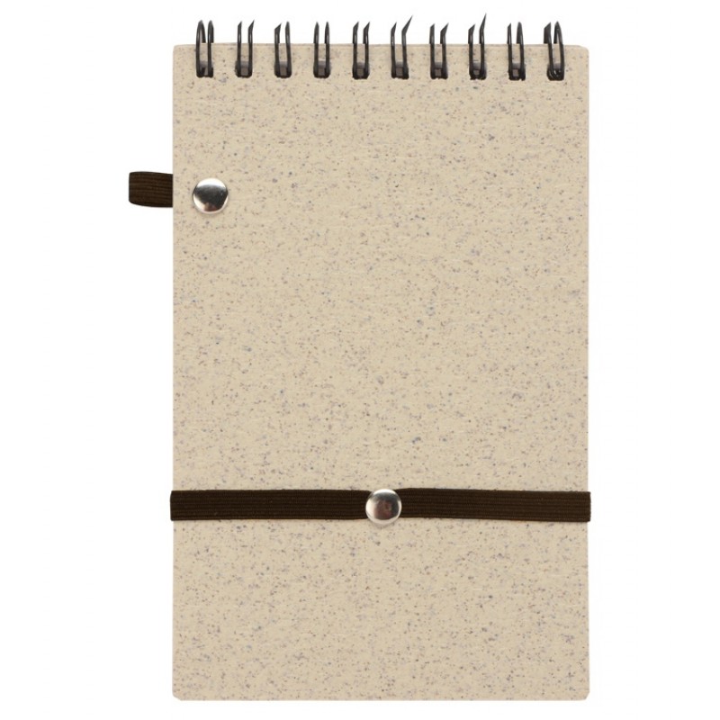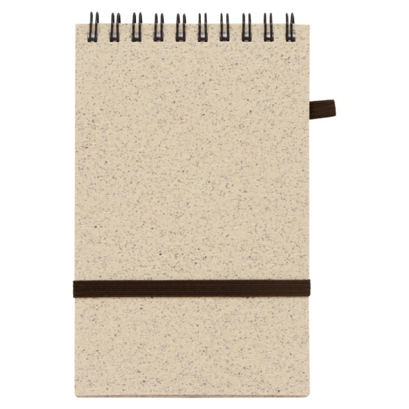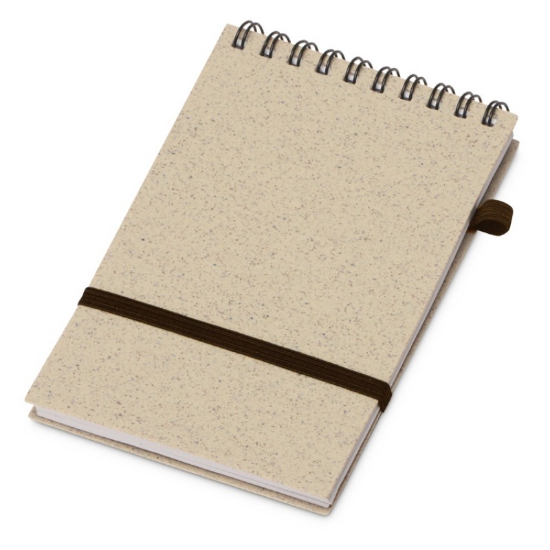 Блокнот с обложкой из переработанной пшеницы и пластика. Блок состоит из 60 листов переработанной бумаги белого цвета. Крепление - пружина. Дополнен петлей для ручки и горизонтальной резинкой.