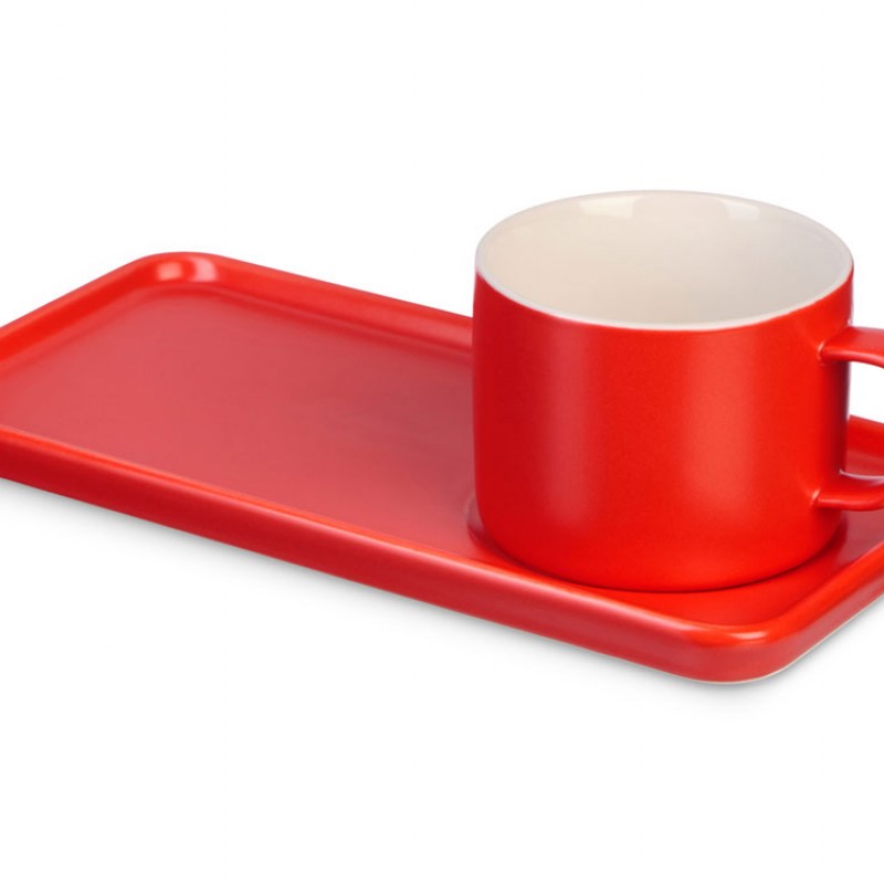 Чайная пара с необычным прямоугольным блюдцем — на нем хватит места не только для чашки, но и для пирожного. Весь силуэт этого комплекта — лаконичный, строгий, прямоугольный, что создает прекрасный фон для нанесения логотипа. Удобство этой чайной пары еще и в том, что для чашки предусмотрена отдельная ниша, которая не даст ей соскользнуть.