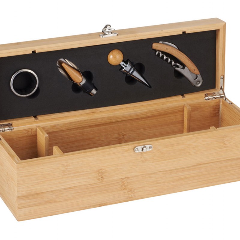 Набор Anniversary представляет собой прямоугольный бамбуковый футляр для бутылки вина, дополненный кольцом-каплеуловителем, пробкой, воронкой и штопором, которые украшены бамбуковыми вставками. Аксессуары располагаются в специальных гнездах, расположенных на крышке, благодаря чему их очень удобно хранить. Из-за особенностей бамбукового материала качество лазерной печати может отличаться. Гравировка (CO2 лазер) (Без чернения) на данный товар осуществляется бесплатно. Оплачивается только настройка оборудования в размере 950 рублей на весь тираж.