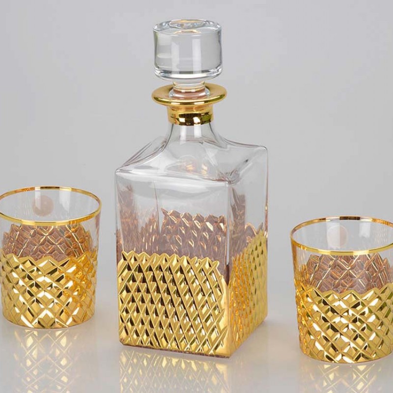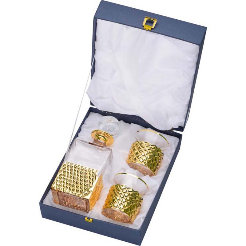 Стильный набор для виски из прозрачного хрусталя рассчитан на две персоны. Набор включает в себя графин, пару бокалов и футляр для хранения. Хрустальная поверхность графина и бокалов задекорирована интересным золотистым узором.