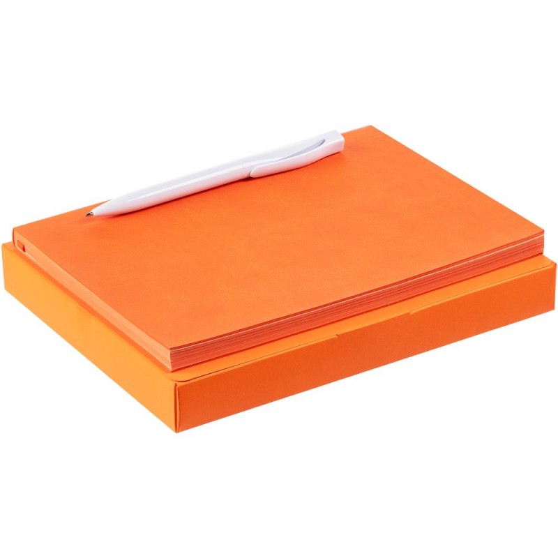 Компактный набор со стильным ежедневником в гибкой обложке с покрытием софт-тач и подходящей ручкой. Все составляющие сложены в самосборную коробку, которая придает набору законченность.