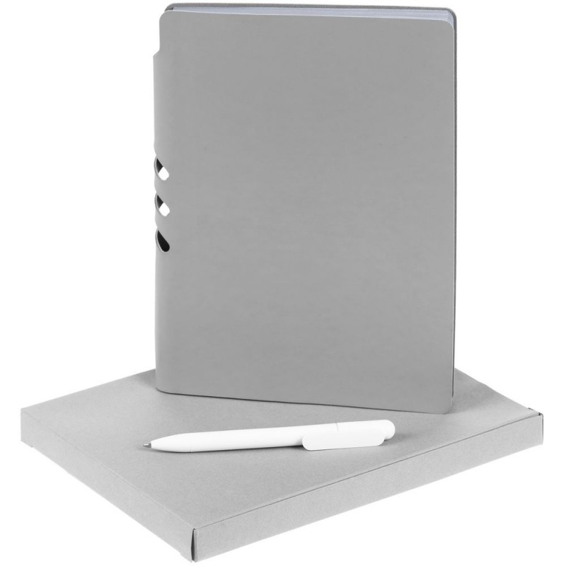 Удобный ежедневник с гибкой обложкой и местом под ручку в корешке, миниатюрная ручка из переработанного пластика и компактная самосборная коробка — простые составляющие полезного делового набора.