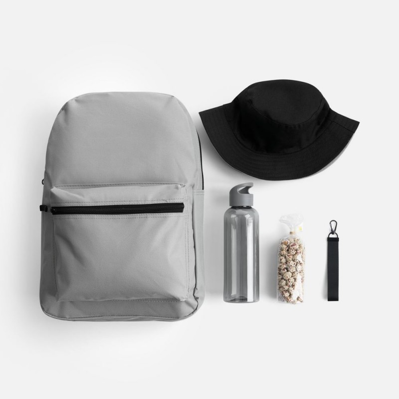 В нем есть все необходимое для комфортной летней прогулки: всегда актуальная в солнечный день панама, стиль которой можно менять буквально на ходу; бутылка для воды оптимального объема, а также сладкий снек для полезного и питательного перекуса. А захватить все с собой, конечно, будет удобно в лаконичном базовом городском рюкзаке, дополнительно оформленном ремувкой — стильным съемным текстильным брелком.