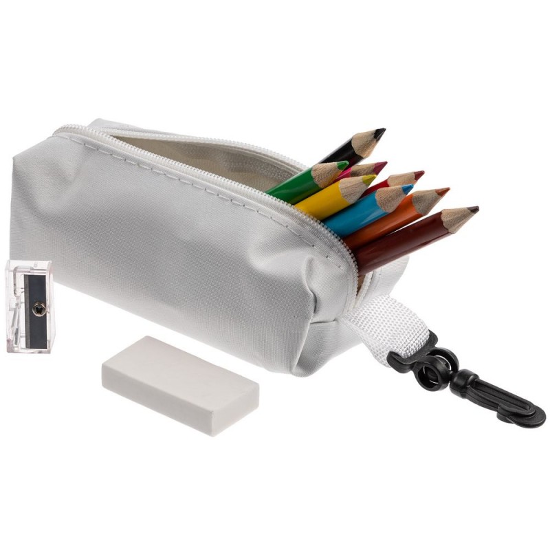 8 цветных карандашей и точилка с ластиком в пенале с карабином, который можно пристегнуть к рюкзаку или сумке.