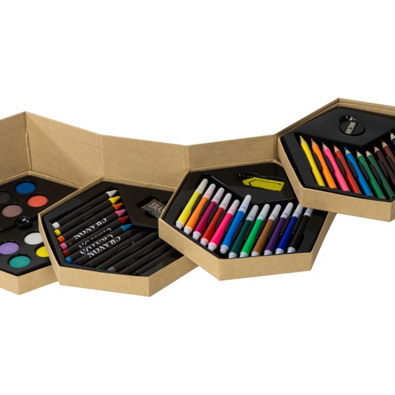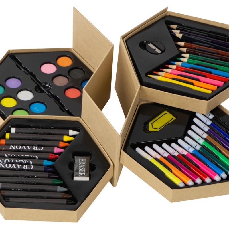 Набор из 52 предметов для рисования. 12 маркеров, 12 цветных карандашей, 12 восковых карандашей, 12 акварельных красок, кисточка, точилка, резинка и большая скрепка.