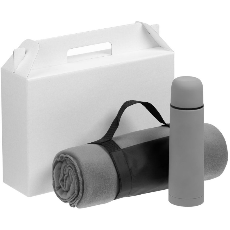 | Материал | плед - флис, плотность 180 г/м²; термос - нержавеющая сталь, 304 внутри, 201 снаружи, пластик, покрытие софт-тач; коробка - микрогофрокартон |