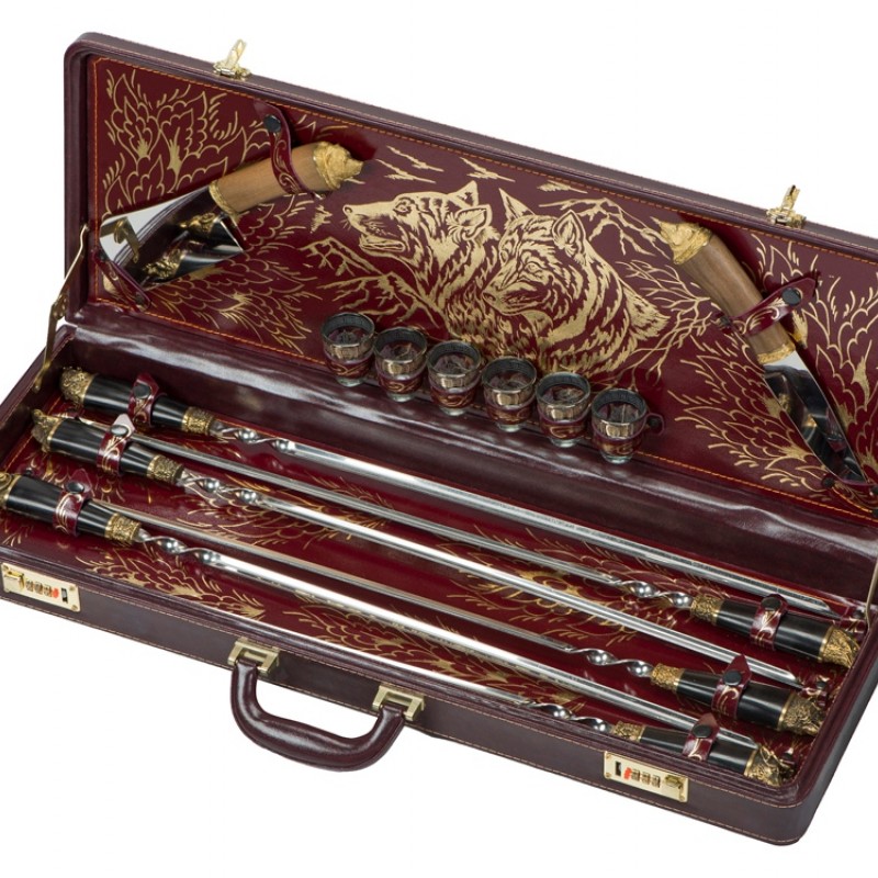 - Шампура (нерж.сталь 3,5 х 2,5 х 67 см), рукоять орех с бронзовым литьем – 6 шт.