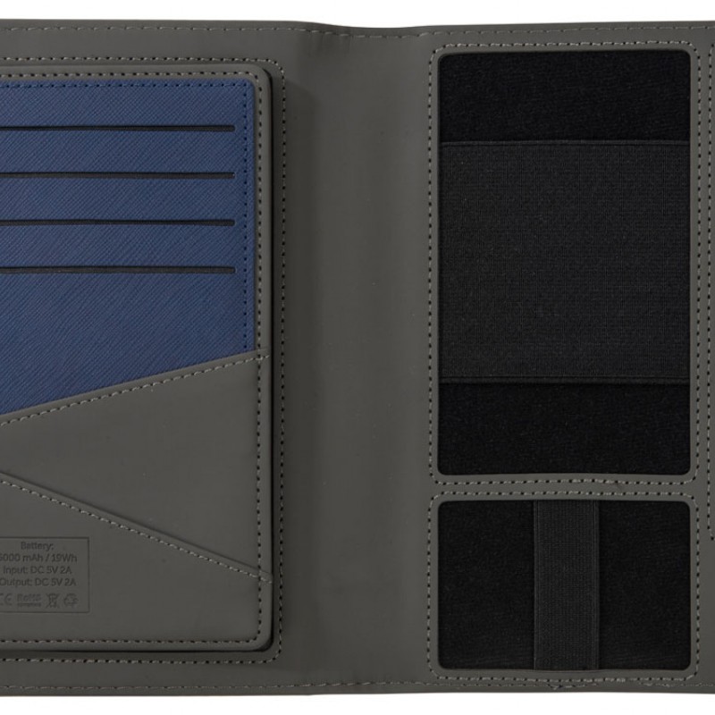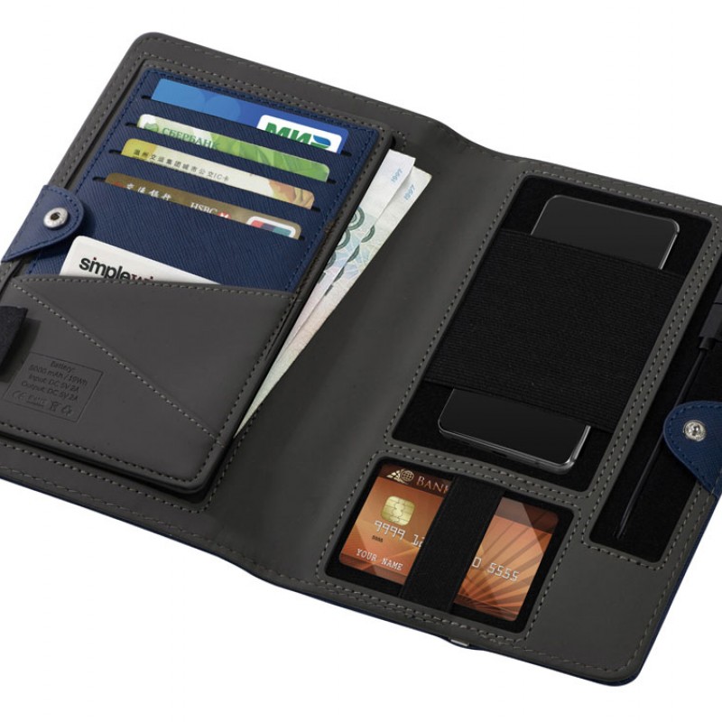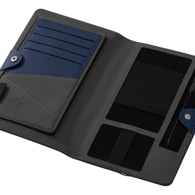 Органайзер закрывается на кнопку, имеет фиксирующие резинки для проводов и других мелочей, а также большой карман, отсек для паспорта и 4 — для карточек. Для проводной зарядки предусмотрен встроенный провод.