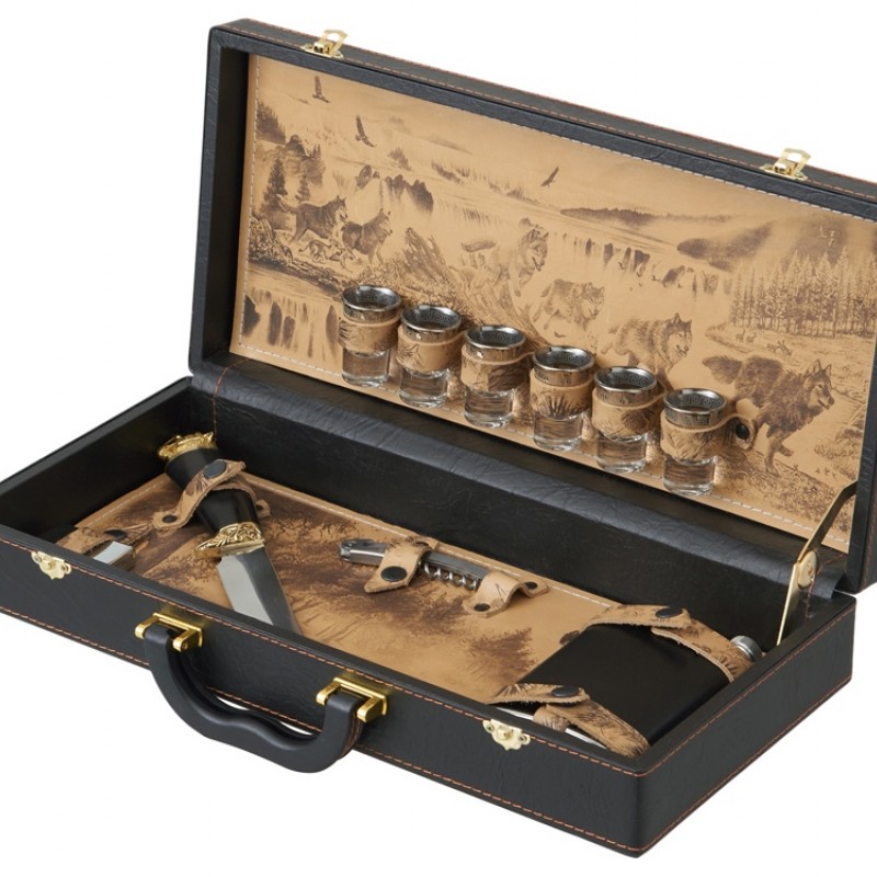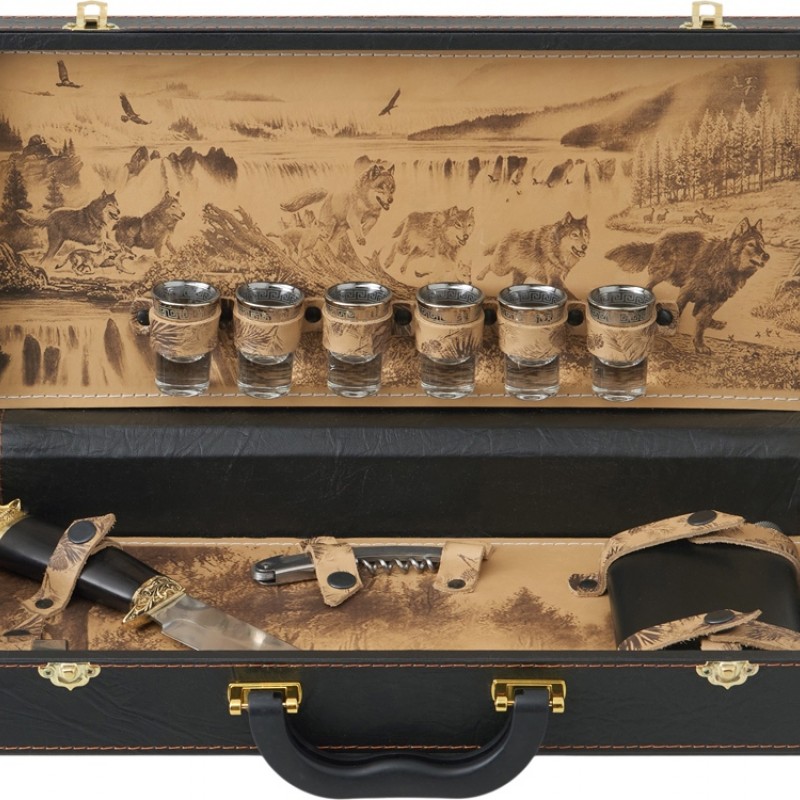 Все аксессуары упакованы в кейс из сплит-кожи, внутренняя отделка натуральная кожа с художественным выжиганием. Каждое изделие уникально, так как художественное выжигание может отличаться от представленного на фото, что придаёт набору особую индивидуальность. Все аксессуары надежно крепятся к кейсу кожаными ремешками на кнопке, обеспечивая удобство транспортировки и сохранность содержимого.