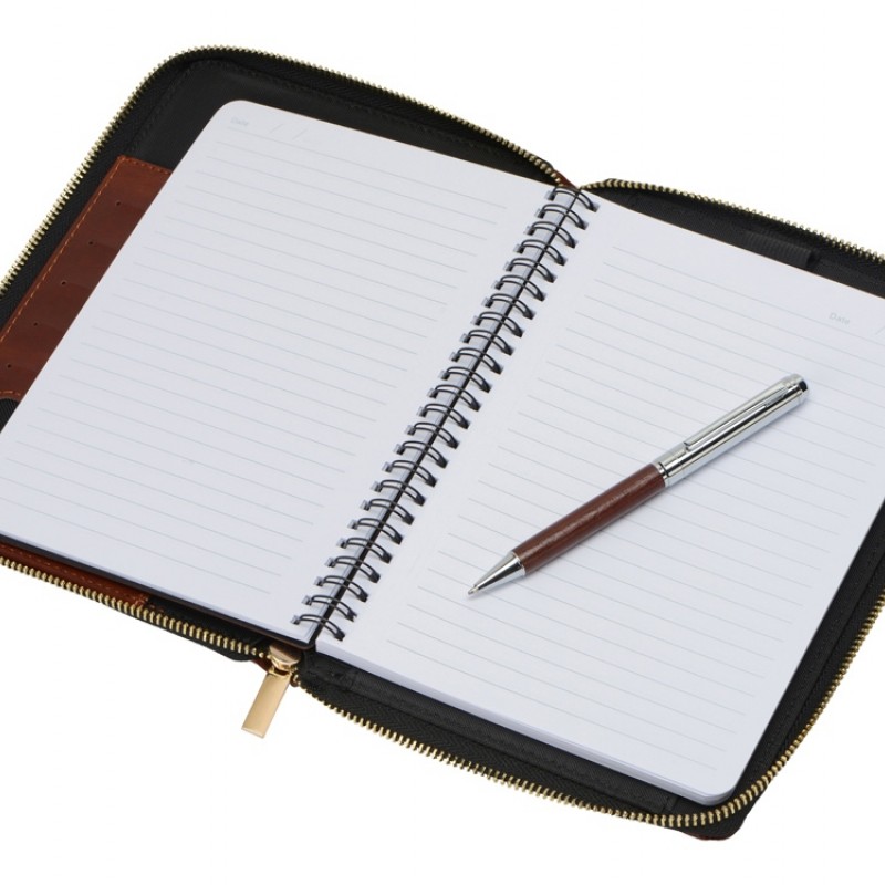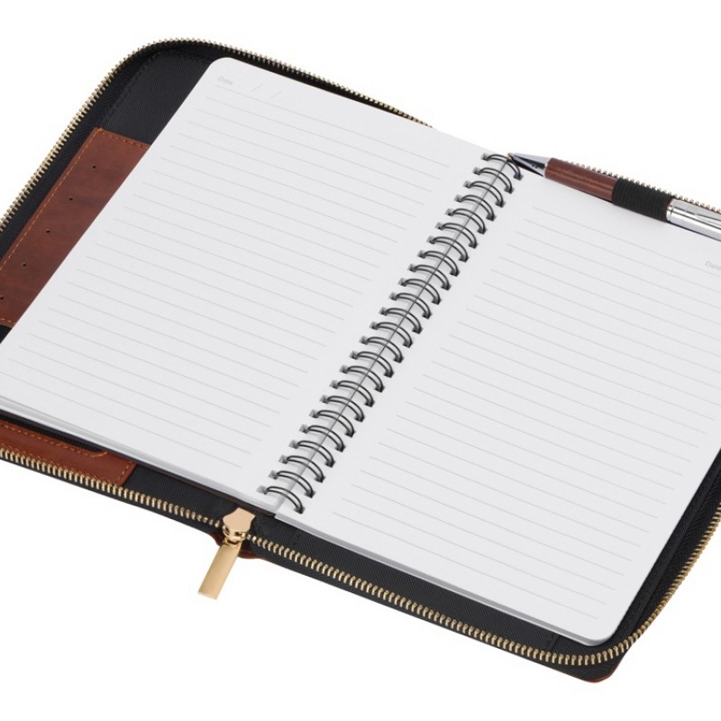 Бизнес блокнот Fabrizio состоит из пенала на молнии выполненного из искусственной кожи, и сменной тетради на 80 листов на кольцах с перфорированными линованными листами белого цвета.
