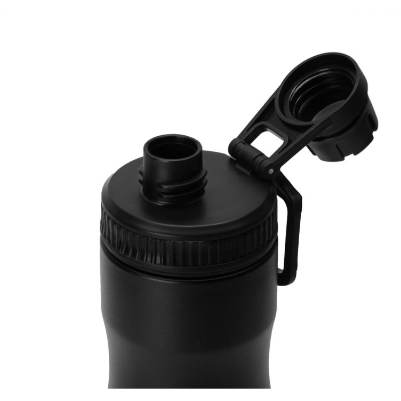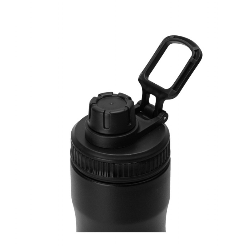 Крышка оснащена складной ручкой-держалкой, которая может быть использована для подвешивания или переноски, а также нетеряемым колпачком. Широкое питьевое отверстие позволяет быстро утолить жажду во время занятий спортом. Рельефное силиконовое кольцо по краю крышки поможет вам быстро и легко отвинтить ее от бутылки.