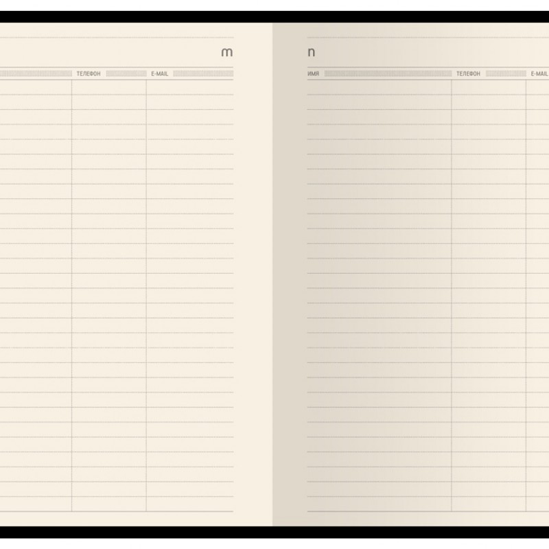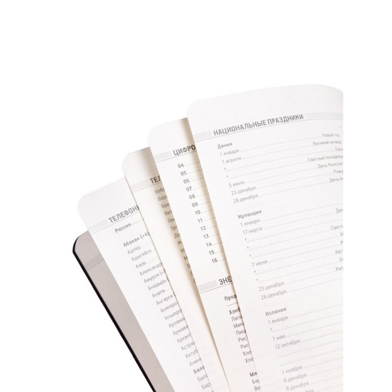 В ежедневнике Megapolis Flex есть полезная справочная информация и телефонная книга, а также страницы для записи идей, мыслей и составления рабочих планов. Для изготовления страниц используется качественный бежевый офсет повышенной плотности (70 г/кв м). Блок не привязан к конкретным датам – они указываются в выделенном поле вверху страницы. Тонированная бумага не дает глазам утомиться даже при длительной работе.