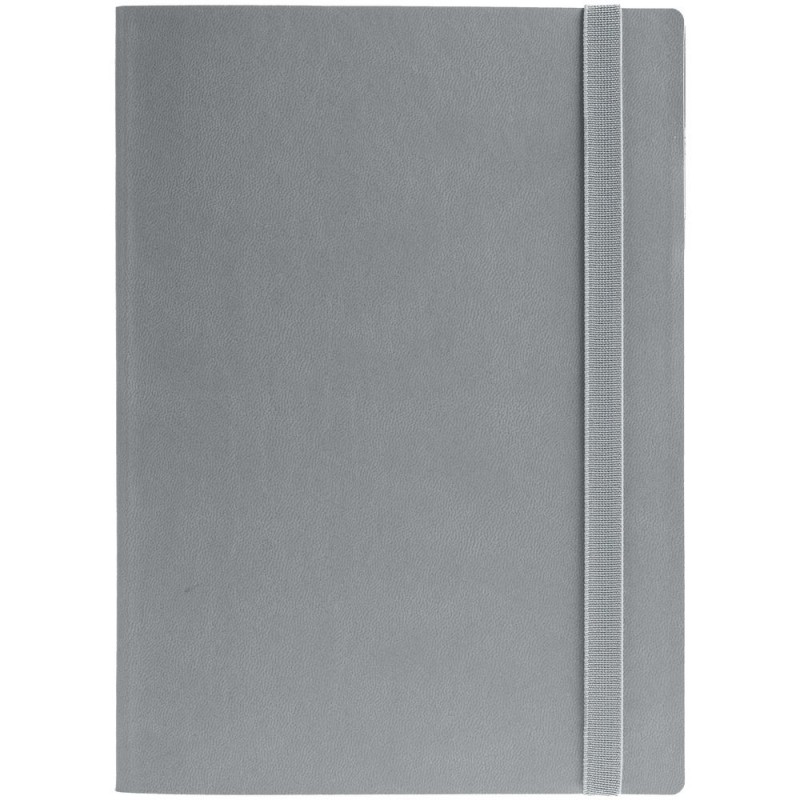 Ежедневник с гибкой обложкой выполнен из материала Latte, серый СС, и дополнен резинкой шириной 1 см, капталом и ляссе серого цвета.