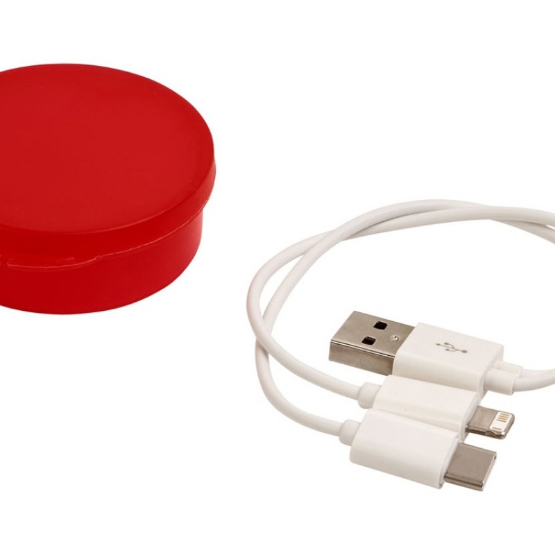 Кабель для зарядки Versa 3-в-1 в футляре. Кабель для зарядки Versa 3-в-1 в круглом футляре с кабелем USB с несколькими коннекторами, включая USB Type C и двойной совместимый коннектор 2-в-1 для устройств Apple® iOS и Android. АБС-пластик.