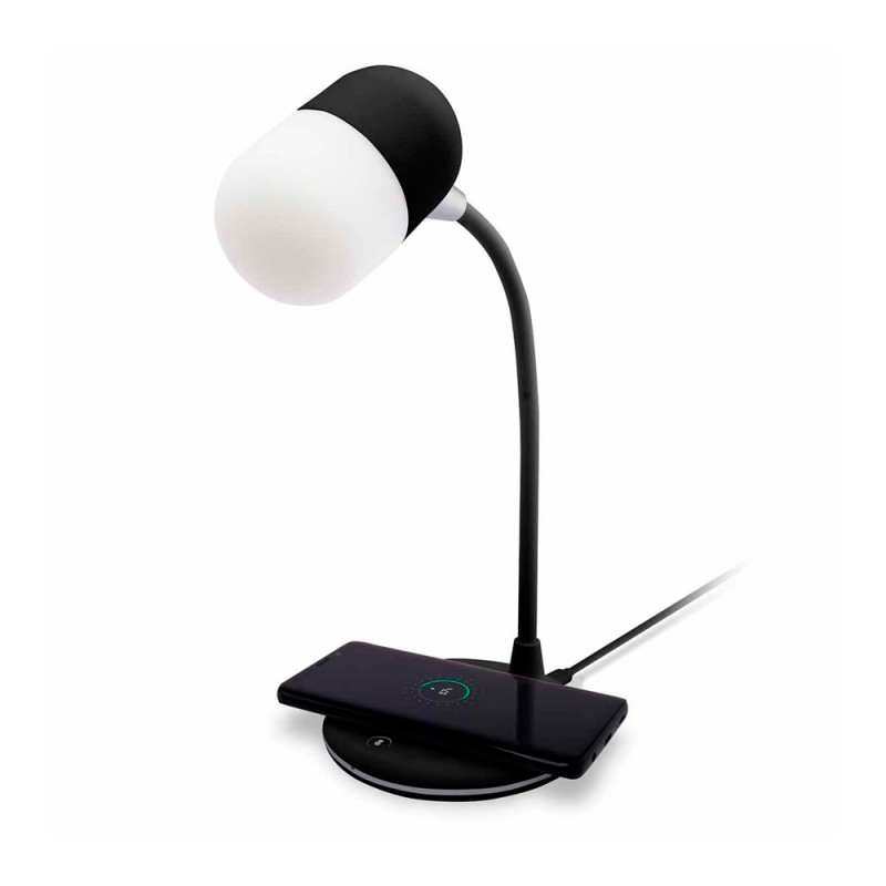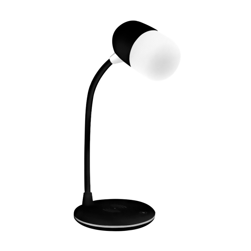 Настольная лампа с колонкой и беспроводной зарядкой Alladin. Тип светодиодного индикатора: cветодиодная панель (яркость 28LM±2), три режима настройки света (яркий, теплый, холодный), 7 светодиодов. Мощность: 5 Вт. Максимальная мощность беспроводного зарядного устройства: 5/10 Вт (опционально). Мощность динамика: 3 Вт. Вход:5V/3A. Версия Bluetooth: V5.0. В комплекте кабель USB и инструкция.