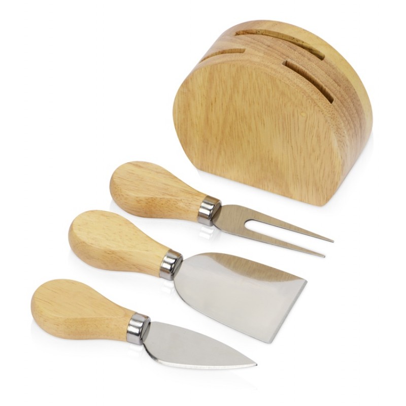 Набор состоит из ножей для сыра, подставки и удобной крафт-коробки. Кухонные инструменты выполнены из надежного каучукового дерева. Оно устойчиво к воздействию влаги, перепадам температуры и большим нагрузкам. Приборы устанавливаются в удобную деревянную подставку, где их можно хранить после использования. В комплект входят: