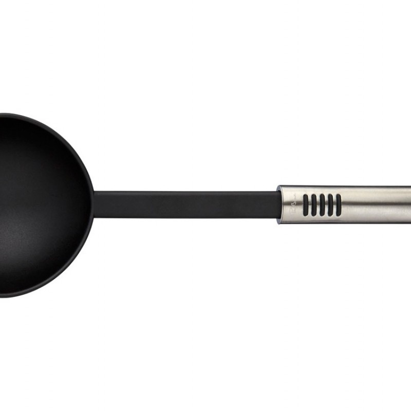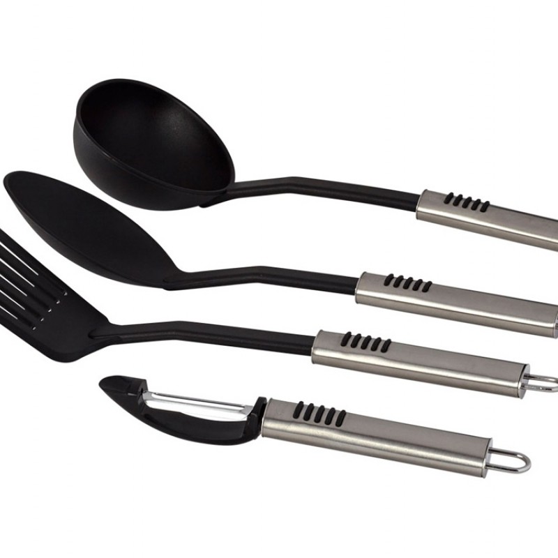 Кухонный набор из 4 предметов. Облегченный набор из четырех предметов включает чистильный нож, ложку, лопатку для сковороды и половник. Отверстия в ручках - для возможности повесить в кухне. Набор упакован в коробку Paul Bocuse. Нержавеющая сталь и нейлон.