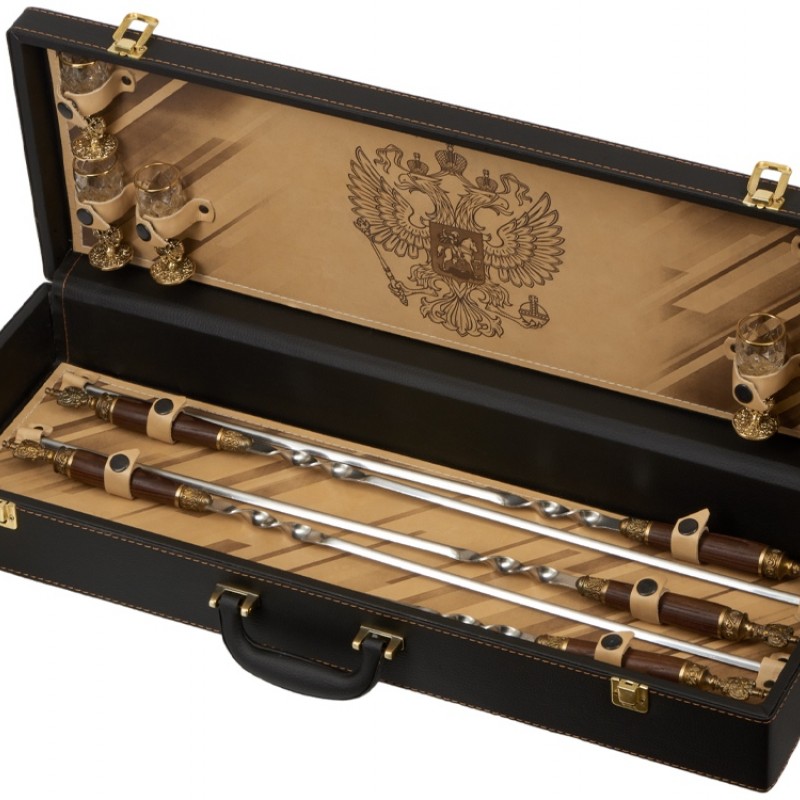 Материал | стопки- хрусталь/литье, шампура- нержавеющая столь/дерево, дипломат- сплит кожа |