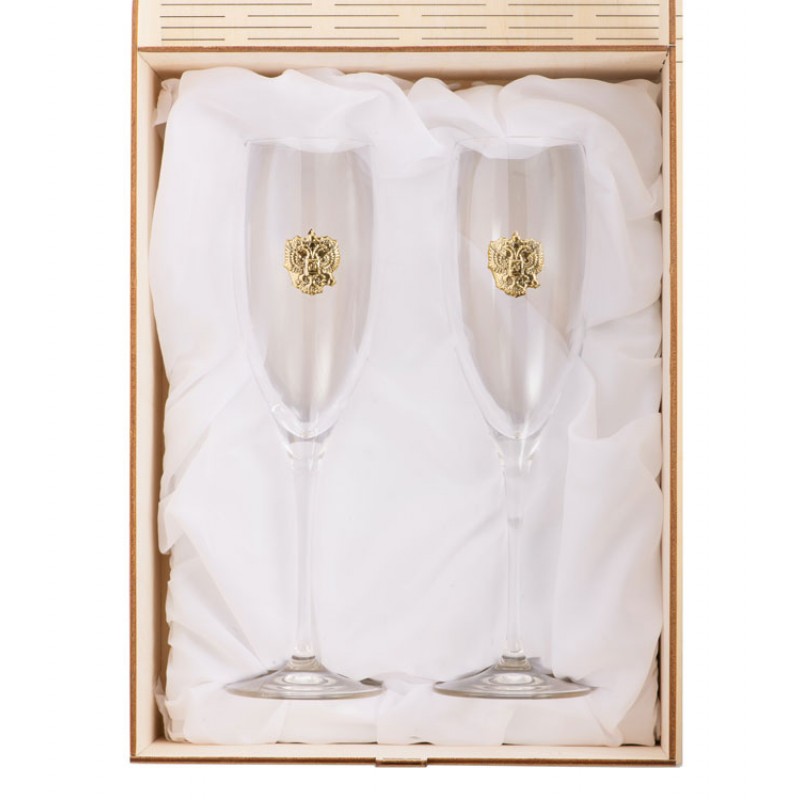 Набор бокалов для шампанского. Благородное флорентийское стекло прекрасно смотрится с российским гербом. Именно так итальянцы решили выразить свою любовь к России.