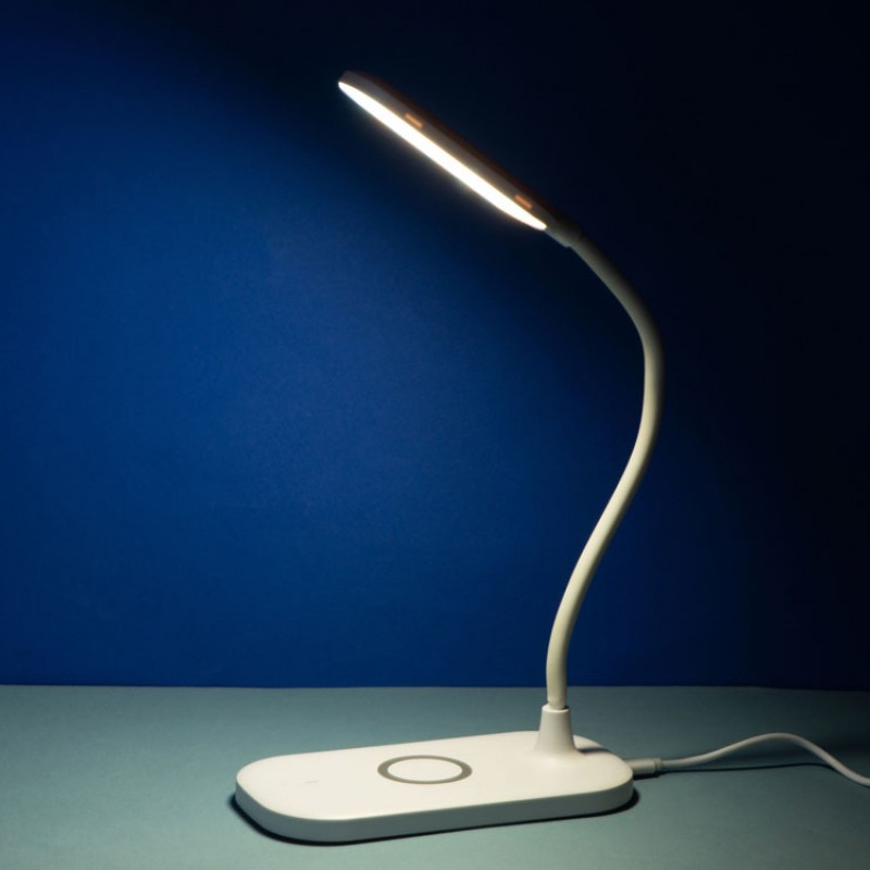 Настольный светильник может менять угол освещения любым удобным вам образом — гибкая ножка позволяет вертеть его во все стороны. Три режима освещения — нейтральный, теплый и холодный — меняются совершенно бесшумно при помощи сенсорной кнопки, которая расположена в подставке.