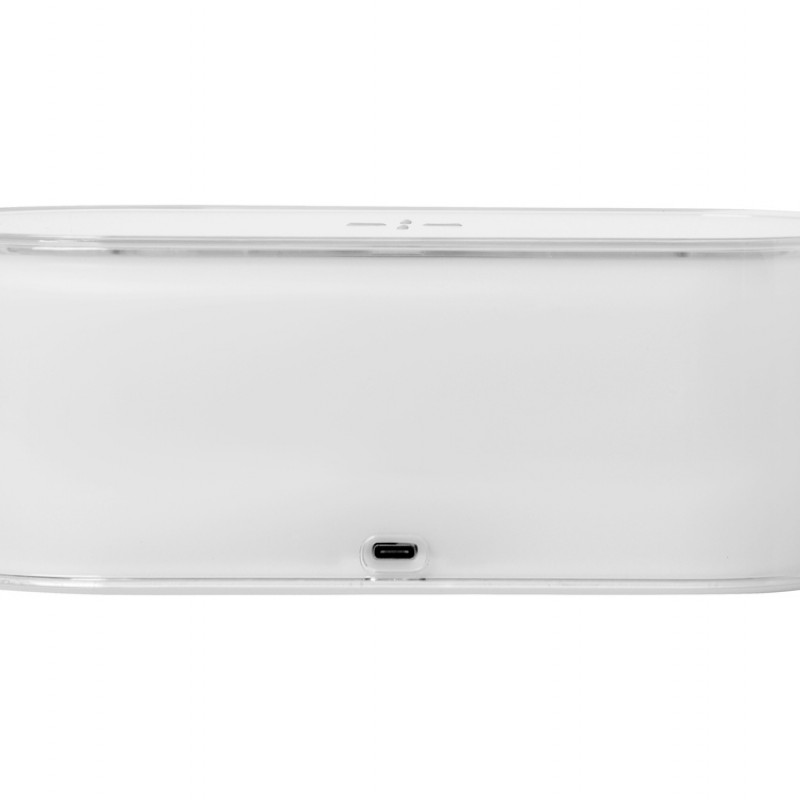 Ночник с RGB-подсветкой из 7 переливающихся цветов. Также есть режимы стандартного и яркого освещения теплым светом. Ночник выполняет функцию зарядной станции для устройств, поддерживающих беспроводную зарядку стандарта Qi мощностью 15 Вт*. Функция ночника работает без подключения к сети благодаря встроенному аккумулятору на 400 мАч. Функция беспроводной зарядки работает только при питании от сети. Устройство можно брендировать методом УФ-печати, тампопечати, а также цифровой печати.