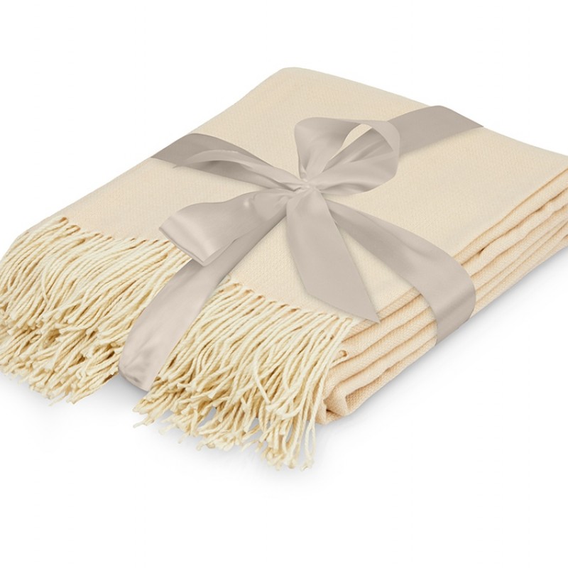 Большой размер этого мягкого плотного пледа позволяет использовать его как одеяло и как покрывало, украшающее интерьер. По бокам плед украшен бахромой. В комплекте идет упаковочная бежевая лента, на которой можно сделать нанесение.