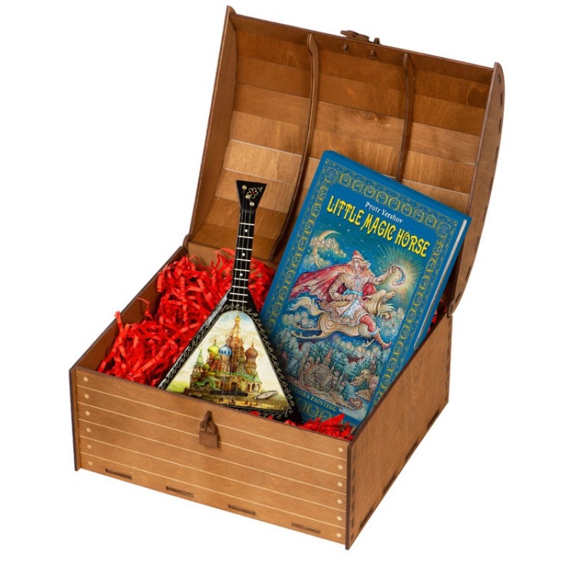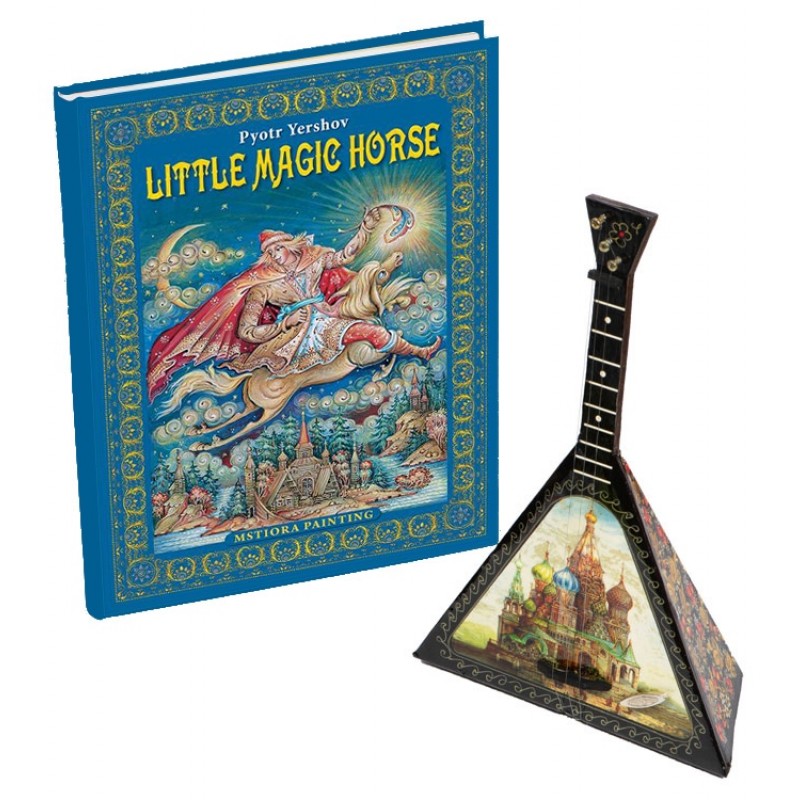 В комплекте с сувенирной балалайкой вы найдете красочную книгу со сказкой в стихах на английском языке П.П. Ершова Конёк - горбунок.