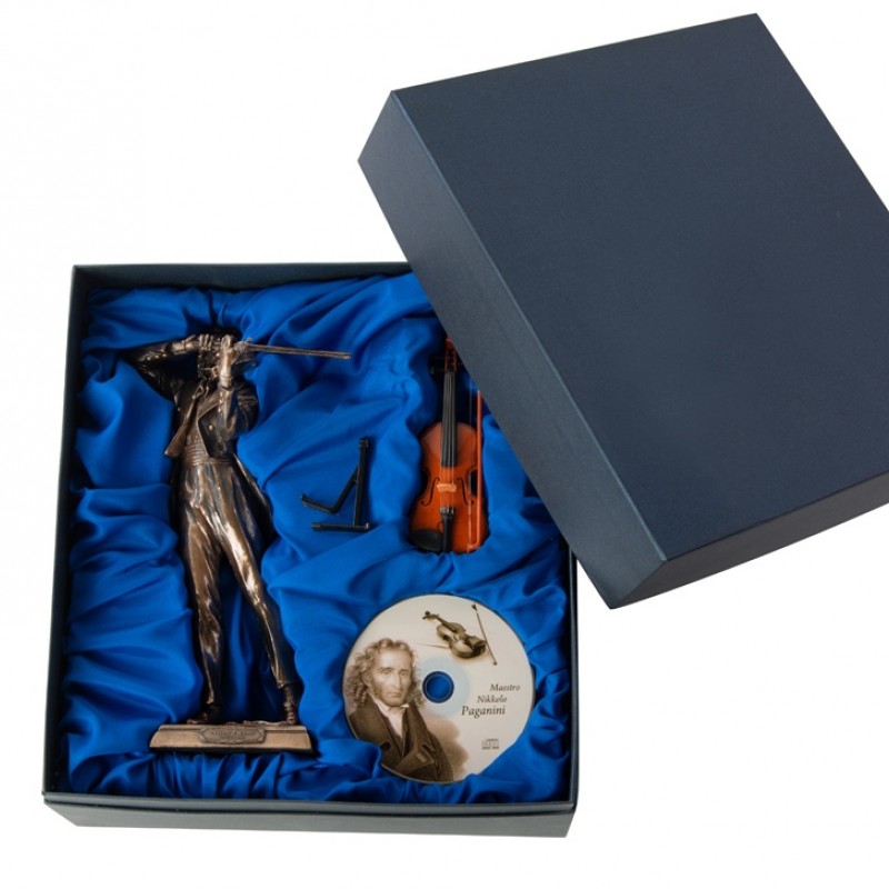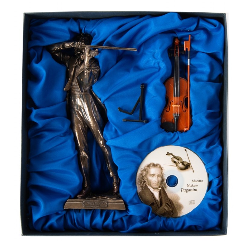 Набор Великий Паганини - это, наверное, самый необычный и в то же время запоминающийся подарок. В набор входят: миниатюрная скульптура, которая передает всю экспрессию, талант и вдохновение Маэстро; модель скрипки, которая является не просто муляжом - стоит к ее струнам прикоснуться смычком, и зазвучит очаровательная мелодия; CD-диск.