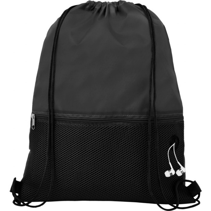 Рюкзак со шнурком и главным отделением на шнуровке в цвет изделия. Имеет один передний сетчатый карман на молнии и порт для наушников. Прочность до 5 кг. Трафаретная печать (1 цвет (цветные изделия)) на данный товар осуществляется бесплатно. Оплачивается только настройка оборудования в размере 8200 рублей на весь тираж.