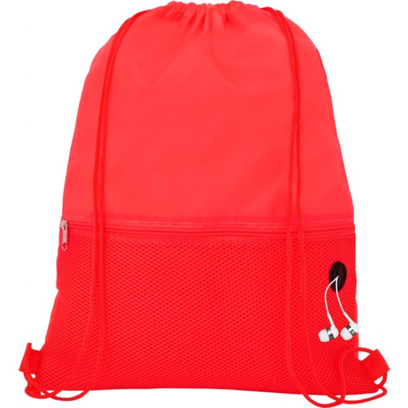 Рюкзак со шнурком и главным отделением на шнуровке в цвет изделия. Имеет один передний сетчатый карман на молнии и порт для наушников. Прочность до 5 кг. Трафаретная печать (1 цвет (цветные изделия)) на данный товар осуществляется бесплатно. Оплачивается только настройка оборудования в размере 8200 рублей на весь тираж.