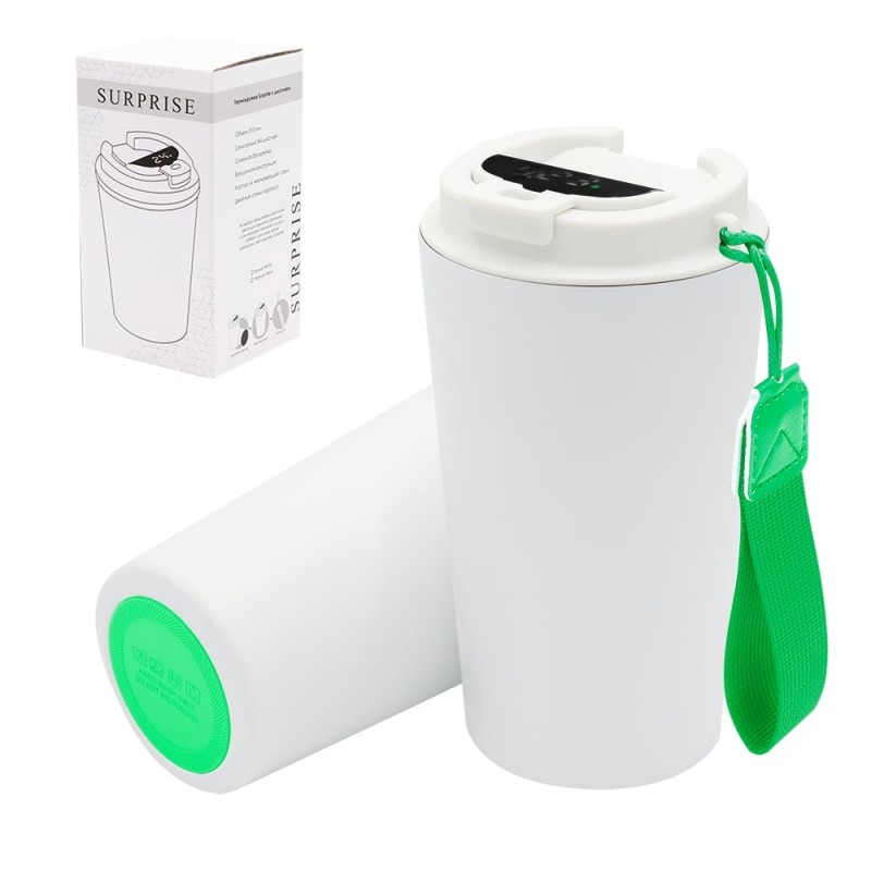 Термокружка Surprise To Go с дисплеем выполнена из пищевой нержавеющей стали. Имеет двойные стенки с вакуумной изоляцией, а крышка изготовлена из пищевого безопасного для человека пластика. Термокружка Surprise To Go не только сохраняет ваши напитки горячими, но и показывает температуру напитка! Уникальная особенность данной термокружки – наличие сенсорного индикатора температуры, расположенного в крышке. Чтобы узнать температуру напитка внутри кружки, достаточно прикоснуться к поверхности крышки. Работает от 1 батарейки типа CR2032 (в комплекте), которую в последующем можно самостоятельно заменить.