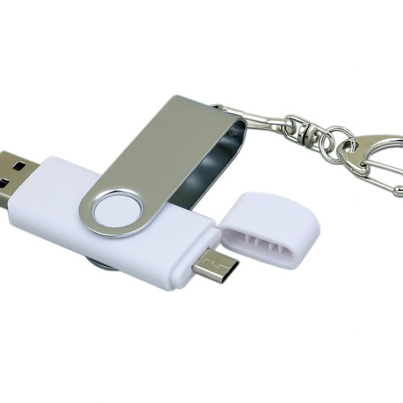 Флеш-накопитель поворотный механизм, c дополнительным разъемом Micro USB с одноцветным металлическим клипом, объем памяти 32 Гб. Пластиковый корпус.