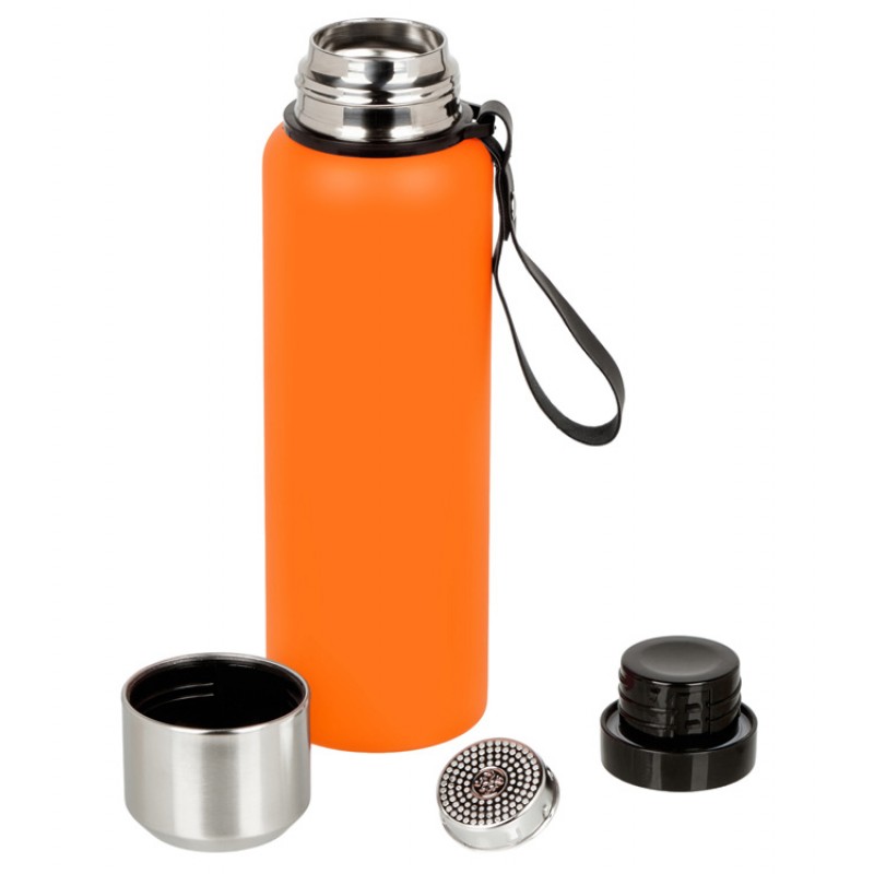 Вакуумный термос c двойными стенками из пищевой нержавеющей стали 304 марки для небольших путешествий и отдыха на природе. Надежно удерживает тепло и холод в течение 24 часов. Крышку можно использовать в качестве чашки. В комплекте имеется съемное ситечко из нержавеющей стали. Имеется прочный и удобный ремешок для переноски. Корпус покрыт специальной порошковой краской для надежного хвата и защиты от царапин. Объем 800 мл.